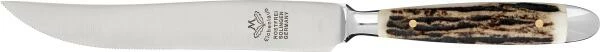 Eichenlaub Steakmesser Tafelgröße aus Hirschhorn. Unverkennbar mit der zum Klingenrücken zeigenden Spitze. Stabil und mit scharfer Säge versehen ist das Eichenlaub Steakmesser prädestiniert für Fleischgerichte aller Art.