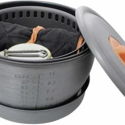 1,8L sowie 2,35L: Die Größe der zum Set gehörenden Töpfe lässt erahnen, dass dieses Kochset ideal für Touren in Begleitung ist, bei denen gern auch mal mehr gekocht werden kann. Zum Set gehört auch der Wasserkesselstand, welcher der Pfanne zusätzliche Standsicherheit gibt. Töpfe und die antihaftbeschichtete Pfanne, Windschutz, Stand, Deckel und auch die Griffzange sind aus hart anodisiertem Aluminium, der Spiritusbrenner aus Messing. Das gesamte Set lässt sich für den Transport platzsparend ineinander stellen. Der klappbare Griff am Flammenregulierer ermöglicht ein einfaches Löschen der Flamme.