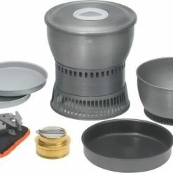 Besonders effizient, groß und dennoch kompakt: So lassen sich die Vorzüge dieses umfangreichen Kochsets umschreiben, das viel Zubehör enthält. Für die Effizienz steht der Wärmetauscher, mit dem sich Mahlzeiten deutlich schneller und mit geringerem Energieverbrauch zubereiten lassen.