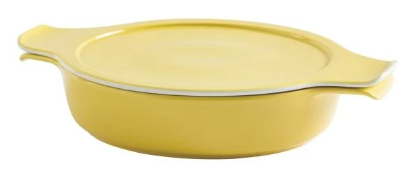 Eschenbach flacher Topf mit Deckel Cook & Serve in hellgelb. In dem flachen Kochtopf können Speisen in einem zubereitet, erwämt und serviert werden. Die Schale ist darüber hinaus für den Backofen, die Mikrowelle und den Grill geeignet. Induktionstauglich!