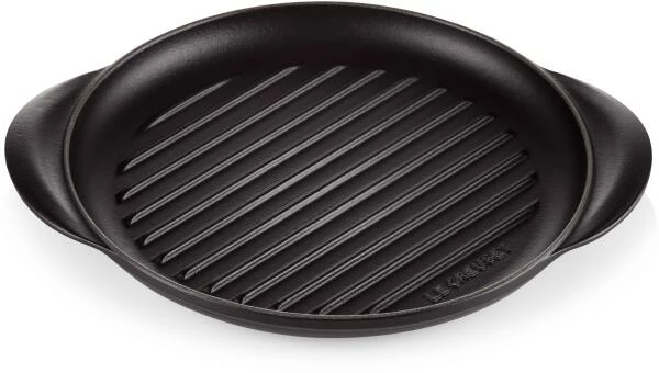 Gusseisen in schwarz. Fleisch und auch Gemüse werden kross und mit den typischem Grillmuster angebraten.