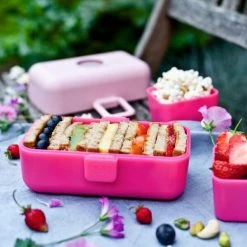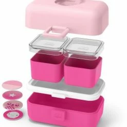 Modular und ultrakompakt: Die Monbento Bentobox Tresor für Kids passt sich mit seinem mikrowellentauglichen, hermetisch dichtem Behälter und den beiden Kästchen an die gastronomischen Vorlieben der Kleinen an. Die Bento-Box aus hochwertigen Kunststoff liegt dank der Soft Touch-Beschichtung besonders gut in der Hand. Die Lunchbox besteht aus einem Behälter, Zwischendeckel und zwei kleinen Kästchen. Dadurch können Mahlzeiten ganz individuell zusammengestellt werden: Ob ein frisch belegtes Pausenbrot, knackiges Obst oder Gemüse-Variationen – in dieser auffallend bunten Lunchbox schmeckt das Essen doppelt so gut!