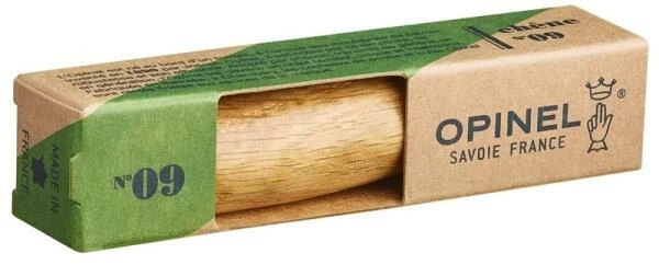 Opinel Messer, Größe 9, Eiche. Opinel präsentiert das bekannte Taschenmesser No. 09 mit einem attraktiven Griff aus edlem Eichen-Holz. Die Klinge aus rostfreiem Sandvik-Stahl 12C27 wird im geöffneten Zustand durch das Drehen des Virobloc Rings zuverlässig gesichert. Eine Speziallackierung schützt den aus einem Stück Eichen-Holz gefertigten Griff vor Feuchtigkeit.