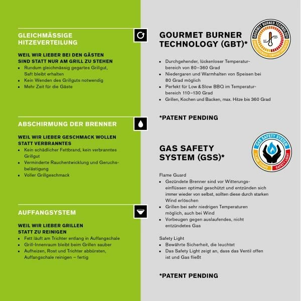 Die Gourmet Burner Technology ermöglicht die Nutzung eines durchgehenden, lückenlosen Temperaturbereichs von 80 – 360 Grad in der Standard Position, dies gibt es bei keinem anderen Grill auf dem Markt. In Verbindung mit dem neuen, komplett aus Edelstahl gefertigten Brennersystem erschließen sich so ganz neue Möglichkeiten in Sachen Grill-Vielfalt. Neu ist es problemlos möglich Fleisch und Fisch bei lediglich 80 Grad niederzugaren – für noch saftigeres Grillgut!