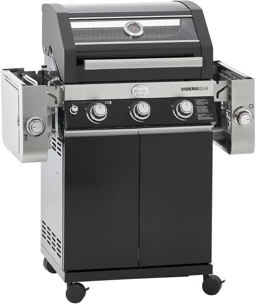 Rösle Gasgrill BBQ-Station VIDERO G3-S Vario+ in schwarz. Gasbetriebener VIDERO G3-S Vario+ BBQ-Grill mit 3 Hauptbrennern, komfortabler Haupt-Grillfläche, Warmhalterost, Seitenbrenner, klappbaren Seitentischen, beleuchteten Drehknöpfen, Deckelthermometer u.v.m.