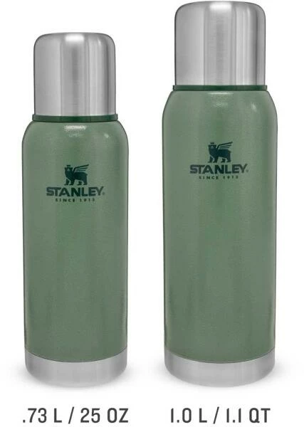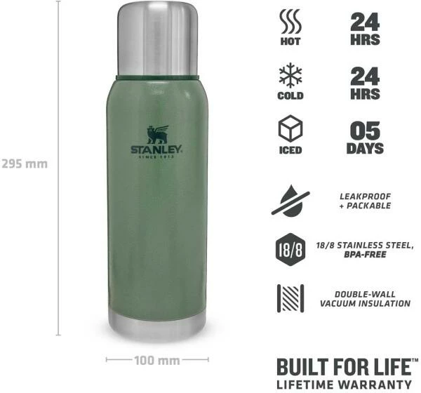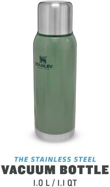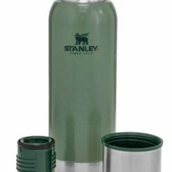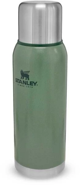 Die aus rostfreiem Edelstahl gefertigte Stanley ADVENTURE VAKUUM-FLASCHE ist mit einer schützenden, grünen Hammerschlaglackierung versehen. Die doppelwandige Vakuum-Isolation hält Getränke bis zu 24 Stunden heiß oder kalt. Über dem Flaschenverschluss sitzt ein Trinkbecher, der ebenfalls isolierend ausgelegt ist. Durch die 5 cm weite Öffnung lässt sich die Flasche sehr gut reinigen. Fassungsvermögen: 1 Liter.
