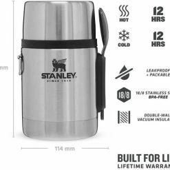 Der praktische Stanley ADVENTURE FOOD CONTAINER ist ein geeigneter Begleiter für unterwegs. In die große Öffnung mit 7,8 cm Durchmesser lassen sich sowohl kalte als auch warme Speisen bequem einfüllen. Auch die Reinigung des Containers geht leicht von der Hand. Der doppelwandige 18/8 Edelstahl-Container bietet eine Vakuum-Isolation und hält den Inhalt bis zu 12 Stunden heiß oder kalt. Im Deckel befindet sich ein zusätzliches Fach, welches hervorragend zum Verstauen von Streichhölzern, Geld oder Schlüssel verwendet werden kann. Das mitgelieferte Essbesteck rundet das Gesamtpaket ab. Fassungsvermögen 532 ml.