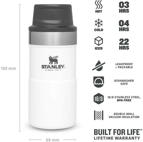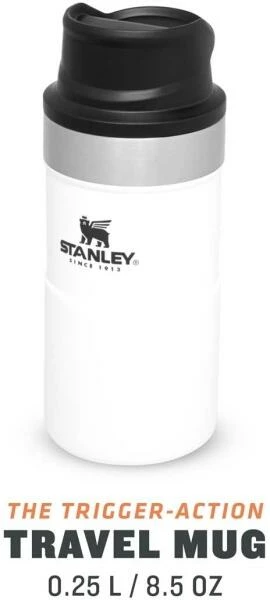 Mit der Slim Line Version des TRIGGER-ACTION TRAVEL MUG führt Stanley eine überarbeitete Version der einhändig bedienbaren Becher ein. Durch das neue, schlankere Design liegt der Becher noch angenehmer in der Hand und die 250ml-Variante passt unter die meisten Kaffee-Automaten. Das Drücken der großen und sehr leichtgängigen Taste zum Aktivieren der Trinköffnung mit einer Hand macht Trinken – on the go – zum Vergnügen. Der polarweisse Trinkbecher aus rostfreiem 18/8-Edelstahl mit Vakuumisolierung besitzt ein Fassungsvermögen von 250 ml und hält Getränke bis zu 3 Stunden heiß oder 4 Stunden gekühlt. Der TRIGGER-ACTION TRAVEL MUG ist komplett spülmaschinenfest, auslaufsicher und passt in gängige PKW-Getränkehalter. BPA-frei.