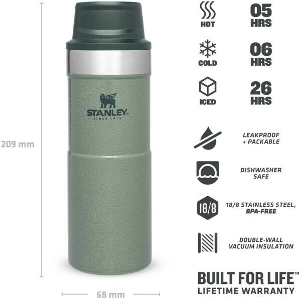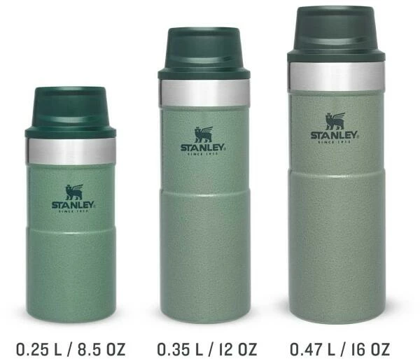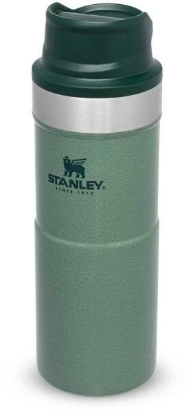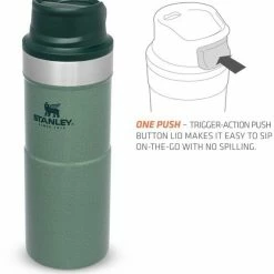 Mit der Slim Line Version des TRIGGER-ACTION TRAVEL MUG führt Stanley eine überarbeitete Version der einhändig bedienbaren Becher ein. Durch das neue, schlankere Design liegt der Becher noch angenehmer in der Hand und passt in alle gängige PKW-Getränkehalter. Das Drücken der großen und sehr leichtgängigen Taste zum Aktivieren der Trinköffnung mit einer Hand macht Trinken – on the go – zum Vergnügen. Der hammerschlaggrüne Trinkbecher aus rostfreiem 18/8-Edelstahl mit Vakuumisolierung besitzt ein Fassungsvermögen von 354 ml und hält Getränke bis zu 5 Stunden heiß oder 6 Stunden gekühlt. Der TRIGGER-ACTION TRAVEL MUG ist komplett spülmaschinenfest und auslaufsicher. BPA-frei.