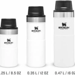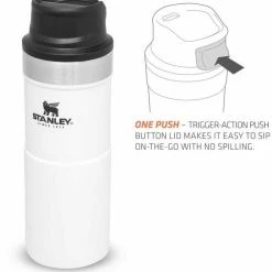 Mit der Slim Line Version des TRIGGER-ACTION TRAVEL MUG führt Stanley eine überarbeitete Version der einhändig bedienbaren Becher ein. Durch das neue, schlankere Design liegt der Becher noch angenehmer in der Hand und passt in alle gängige PKW-Getränkehalter. Das Drücken der großen und sehr leichtgängigen Taste zum Aktivieren der Trinköffnung mit einer Hand macht Trinken – on the go – zum Vergnügen. Der polarweisse Trinkbecher aus rostfreiem 18/8-Edelstahl mit Vakuumisolierung besitzt ein Fassungsvermögen von 354 ml und hält Getränke bis zu 5 Stunden heiß oder 6 Stunden gekühlt. Der TRIGGER-ACTION TRAVEL MUG ist komplett spülmaschinenfest und auslaufsicher. BPA-frei.