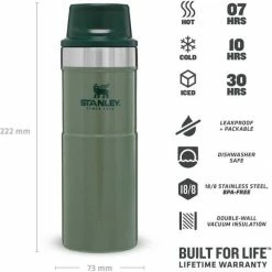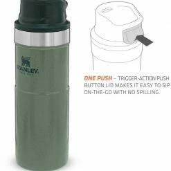 Mit dem Stanley CLASSIC TRIGGER-ACTION TRAVEL MUG in Hammertone Green führt Stanley eine neue Generation der Becher mit Einhandbedienung ein. Das Drücken der großen und sehr leichtgängigen Taste zum Aktivieren der Trinköffnung mit einer Hand macht Trinken – on the go – zum Vergnügen. Der Trinkbecher aus rostfreiem 18/8-Edelstahl mit Vakuumisolierung besitzt ein Fassungsvermögen von 473 ml und hält Getränke bis zu 7 Stunden heiß oder sogar 10 Stunden gekühlt. Der TRIGGER-ACTION TRAVEL MUG ist komplett spülmaschinenfest, auslaufsicher und passt in gängige PKW-Getränkehalterungen. BPA-frei.