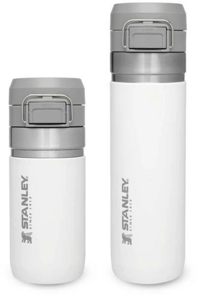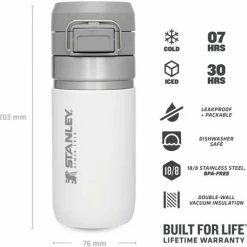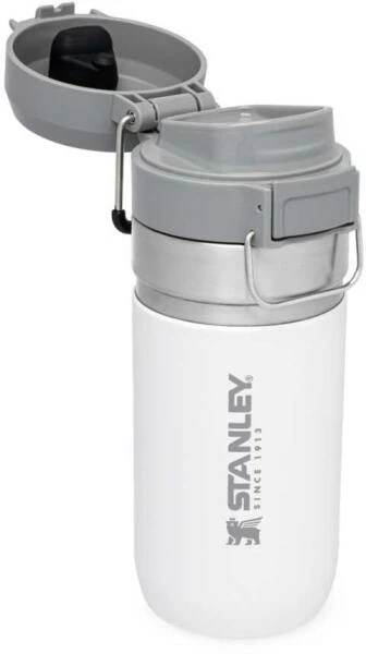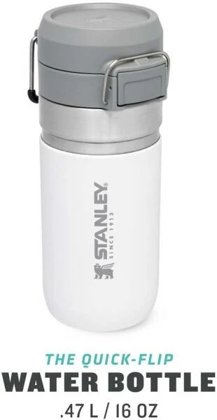 Ob für die Outdoor-Tour, den Sport oder einfach On The Road, die Stanley QUICK-FLIP WATER BOTTLE ist der ideale Begleiter gegen den Durst. Die auslaufsichere Flasche ist mit einem innovativen, zweistufigen Sicherheitsverschluss ausgestattet. Beim Transport wird der Verschluss gegen unbeabsichtigtes Öffnen von einem Edelstahlbügel fixiert. Wird dieser gelöst und der Push-Button Knopf gedrückt, flippt der Deckel federunterstützt auf. Die Trinkflasche aus rostfreiem 18/8-Edelstahl mit Vakuumisolierung besitzt ein Fassungsvermögen von 473 ml und hält Getränke bis zu 5 Stunden heiß oder 7 Stunden gekühlt. Die Flasche passt in gängige PKW-Getränkehalter und ist mit einem beweglichen Bügel zum Anhängen an den Rucksack oder Tragegriff ausgestattet. Alle Teile können in der Spülmaschine gereinigt werden. BPA-frei.