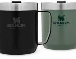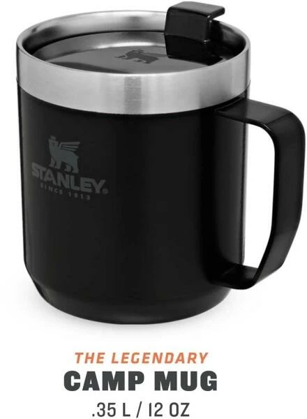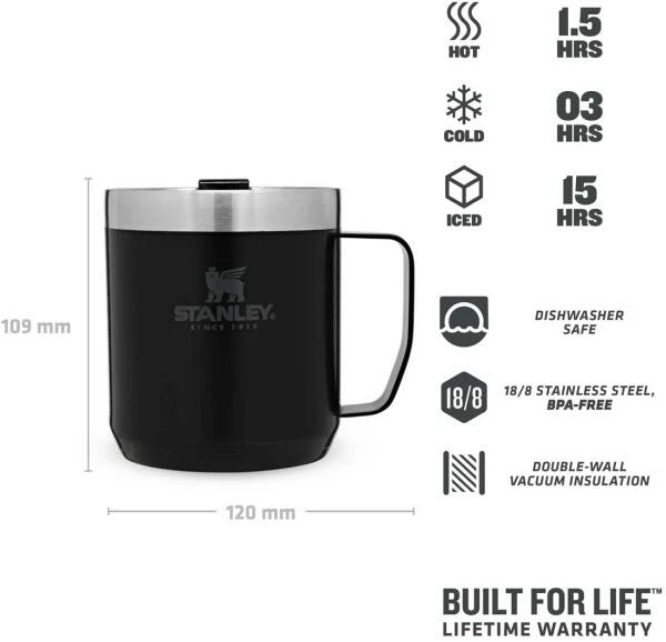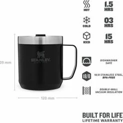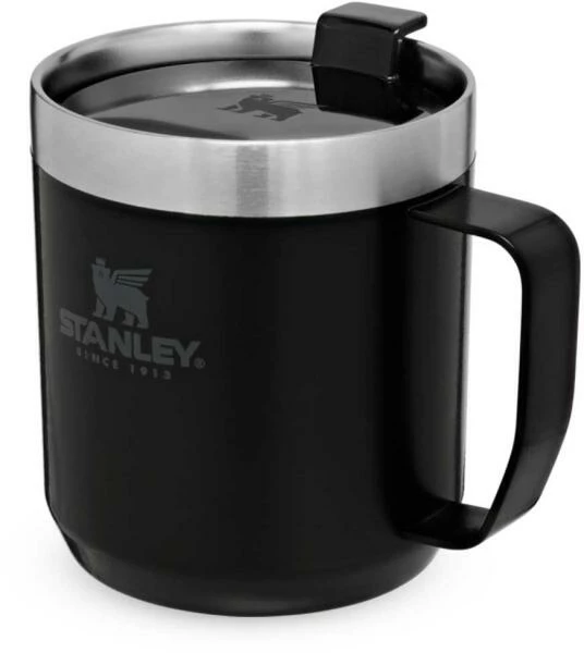 Der Stanley CLASSIC CAMP MUG im neuen Design hält mit seiner doppelwandigen Edelstahl-Vakuumisolierung heiße Getränke bis zu 1,5 Stunden heiß und kalte Getränke bis zu 3 Stunden kalt. Neu ist, dass der aus rostfreiem 18/8-Edelstahl hergestellte Trinkbecher jetzt einen durchsichtigen Deckel aus bruchfestem Tritan-Kunststoff besitzt, aus den es sich noch bequemer trinken lässt. Der mit mattschwarzer Lackierung versehene CLASSIC CAMP MUG ist spülmaschinenfest und alle Teile sind BPA-frei.