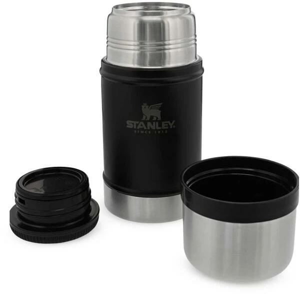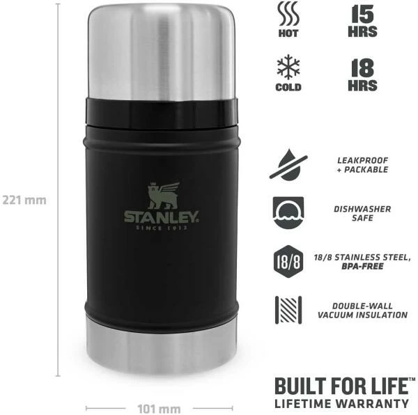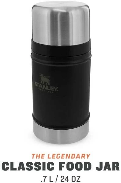 Der praktische Stanley CLASSIC FOOD CONTAINER ist ein toller Begleiter für unterwegs. Durch die große Öffnung mit 7 cm Durchmesser lassen sich sowohl kalte als auch warme Speisen bequem einfüllen. Auch die Reinigung des Containers geht leicht von der Hand. Der doppelwandige 18/8 Edelstahl-Container bietet eine gute Isolation und hält 0,7 Liter bis zu 15 Stunden heiß oder 18 Stunden kalt. Der Deckel hat ein Fassungsvermögen von 0,354 Liter und kann als Gefäß verwendet werden. Eine Lackierung in mattschwarz sorgt für eine ansprechende Optik.