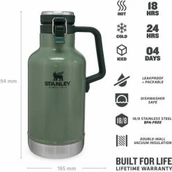 Der aus rostfreiem 18/8 Edelstahl gefertigte Stanley CLASSIC VACUUM BEER GROWLER ist mit einer schützenden, grünen Hammerschlaglackierung versehen. Die doppelwandige Vakuum-Isolation hält Getränke bis zu 18 Stunden heiß oder 24 Stunden kalt. Der seitlich montierte Kunststofftragegriff sorgt für den problemlosen Transport der Flasche. Der robuste Deckelverschluss hält auch kohlensäurehaltigen Getränken sicher Stand. Durch die 6 cm weite Öffnung lässt sich die Flasche sehr gut befüllen und reinigen. Alle Teile sind spülmaschinenfest und natürlich BPA frei. Fassungsvermögen 1,9 Liter.