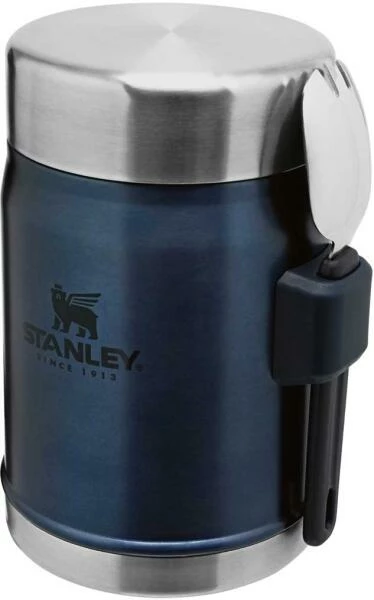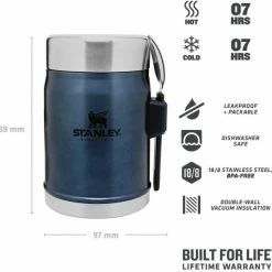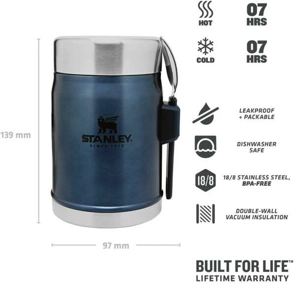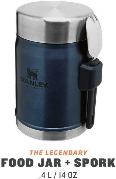 Der Stanley CLASSIC FOOD JAR + SPORK in Nightfall-Blue ist bestens geeignet für die kleine heiße Mahlzeit: Mit einem Fassungsvermögen von 0,4 Liter hält der Essbehälter heiße Speisen bis zu 7 Stunden heiß. Kalte Speisen bleiben aufgrund der doppelwandigen Edelstahl-Vakuumisolierung ebenfalls bis zu 7 Stunden kalt. Der CLASSIC FOOD JAR + SPORK ist auslaufsicher und kompakt. Zum Lieferumfang gehört ein Edelstahl-Spork, also ein Löffel/Gabel-Werkzeug. Das Produkt ist spülmaschinenfest und BPA-frei.