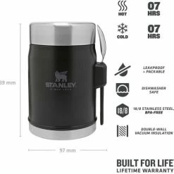 Der mattschwarze Stanley CLASSIC FOOD JAR + SPORK ist bestens geeignet für die kleine heiße Mahlzeit: Mit einem Fassungsvermögen von 0,4 Liter hält der Essbehälter heiße Speisen bis zu 7 Stunden heiß. Kalte Speisen bleiben aufgrund der doppelwandigen Edelstahl-Vakuumisolierung ebenfalls bis zu 7 Stunden kalt. Der CLASSIC FOOD JAR + SPORK ist auslaufsicher und kompakt. Zum Lieferumfang gehört ein Edelstahl-Spork, also ein Löffel/Gabel-Werkzeug. Das Produkt ist spülmaschinenfest und BPA-frei.