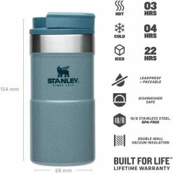 Mit dem Stanley NEVERLEAK TRAVEL MUG werden durch seine doppelwandige Edelstahl-Vakuumisolierung heiße Getränke bis zu 3 Stunden heiß und kalte Getränke bis zu 4 Stunden kalt gehalten. Der Trinkbecher aus rostfreiem 18/8-Edelstahl besitzt ein Fassungsvermögen von 250 ml und verfügt über einen einzigartigen 3-Positionen Deckel, der sich zum einfachen Trinken aufdrehen lässt und beim Schließen fest verriegelt. Der NEVERLEAK TRAVEL MUG ist komplett spülmaschinenfest, auslaufsicher und passt in gängige PKW-Getränkehalterungen. BPA-frei.