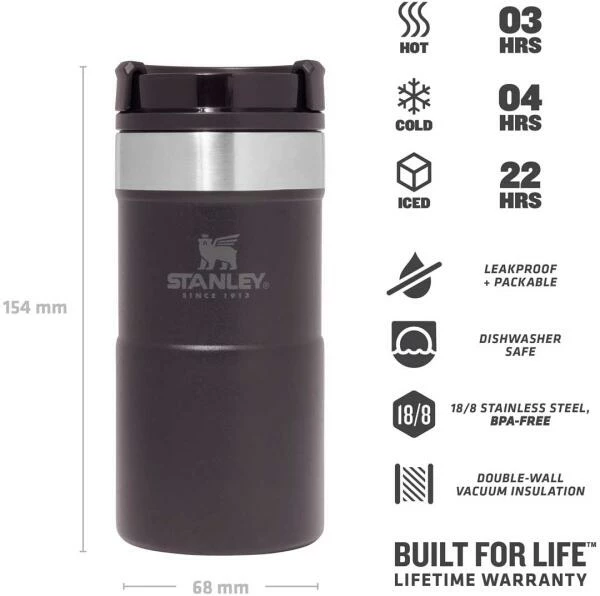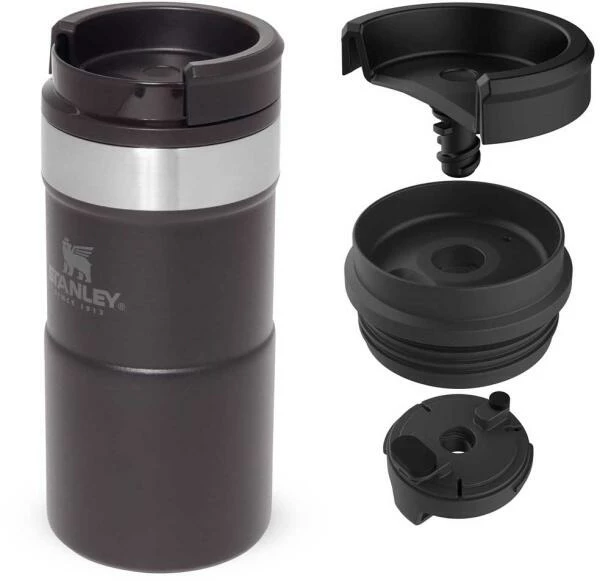 Mit dem Stanley NEVERLEAK TRAVEL MUG werden durch seine doppelwandige Edelstahl-Vakuumisolierung heiße Getränke bis zu 3 Stunden heiß und kalte Getränke bis zu 4 Stunden kalt gehalten. Der Trinkbecher aus rostfreiem 18/8-Edelstahl besitzt ein Fassungsvermögen von 250 ml und verfügt über einen einzigartigen 3-Positionen Deckel, der sich zum einfachen Trinken aufdrehen lässt und beim Schließen fest verriegelt. Der NEVERLEAK TRAVEL MUG ist komplett spülmaschinenfest, auslaufsicher und passt in gängige PKW-Getränkehalterungen. BPA-frei.