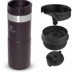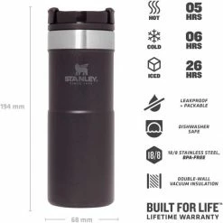 Mit dem Stanley NEVERLEAK TRAVEL MUG werden durch seine doppelwandige Edelstahl-Vakuumisolierung heiße Getränke bis zu 5 Stunden heiß und kalte Getränke bis zu 6 Stunden kalt gehalten. Der Trinkbecher aus rostfreiem 18/8-Edelstahl besitzt ein Fassungsvermögen von 354 ml und verfügt über einen einzigartigen 3-Positionen Deckel, der sich zum einfachen Trinken aufdrehen lässt und beim Schließen fest verriegelt. Der NEVERLEAK TRAVEL MUG ist komplett spülmaschinenfest, auslaufsicher und passt in gängige PKW-Getränkehalterungen. BPA-frei.