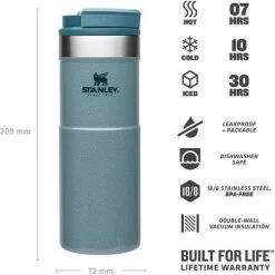 Mit dem Stanley NEVERLEAK TRAVEL MUG werden durch seine doppelwandige Edelstahl-Vakuumisolierung heiße Getränke bis zu 7 Stunden heiß und kalte Getränke bis zu 10 Stunden kalt gehalten. Der Trinkbecher aus rostfreiem 18/8-Edelstahl besitzt ein Fassungsvermögen von 473 ml und verfügt über einen einzigartigen 3-Positionen Deckel, der sich zum einfachen Trinken aufdrehen lässt und beim Schließen fest verriegelt. Der NEVERLEAK TRAVEL MUG ist komplett spülmaschinenfest, auslaufsicher und passt in gängige PKW-Getränkehalterungen. BPA-frei.