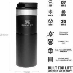 Mit dem Stanley NEVERLEAK TRAVEL MUG werden durch seine doppelwandige Edelstahl-Vakuumisolierung heiße Getränke bis zu 7 Stunden heiß und kalte Getränke bis zu 10 Stunden kalt gehalten. Der Trinkbecher aus rostfreiem 18/8-Edelstahl besitzt ein Fassungsvermögen von 473 ml und verfügt über einen einzigartigen 3-Positionen Deckel, der sich zum einfachen Trinken aufdrehen lässt und beim Schließen fest verriegelt. Der NEVERLEAK TRAVEL MUG ist komplett spülmaschinenfest, auslaufsicher und passt in gängige PKW-Getränkehalterungen. BPA-frei.