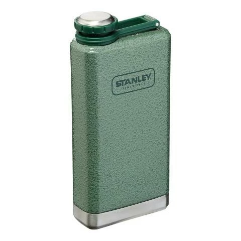 Die Stanley Taschenflasche aus Edelstahl verfügt über 236 ml Fassungsvermögen. Der Verschluss ist gesichert und geht so nicht verloren. Die grüne Lackierung im Hammerschlag-Design unterstreicht die Robustheit der Flasche.