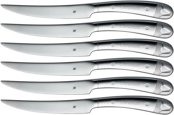 WMF Steakmesser Set 6 Stück Geschenkidee. Besonders lecker schmeckt Gegrilltes außen knusprig und innen saftig zart. Das Steakbesteck-Messer hat eine besonders scharfe Klinge aus Spezialklingenstahl und ist mit Wellenschliff versehen. Der Griff des Messers liegt gut in der Hand.