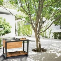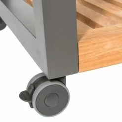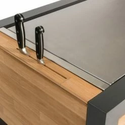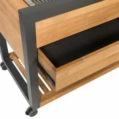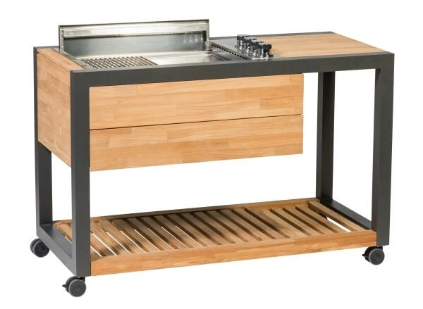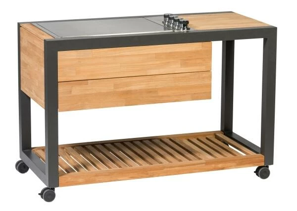 Darüber hinaus punktet der GazzBoy mit seinem edlen Design aus massivem Teakholz und pulverbeschichtetem Aluminiumrahmen. Er bietet alles, was von einer Outdoor-Küche erwartet wird: Eine große Arbeitsplatte, eine praktische Materialschublade mit Soft-Close-Führungen und einen eingebauten Messerhalter für die wichtigsten Kochmesser.